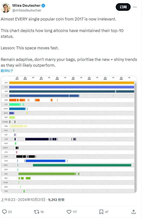 ChainCatcher 消息,加密货币分析师 Miles Deutscher 在社交平台 X 披露数据显示,2017 年至今,绝大多数曾跻身市值排名前十的加密货币项目已淡出市场主流。数据显示,除比特币、以太坊和瑞波币(XRP)外,绝大多数 2017 年的热门代币已退出市值前十名,如莱特币(LTC)、门罗币(XMR)和以太经典(ETC)等。值得注意的是,2018 年后期兴起的 USDT 稳定币持续保持了其市值地位。