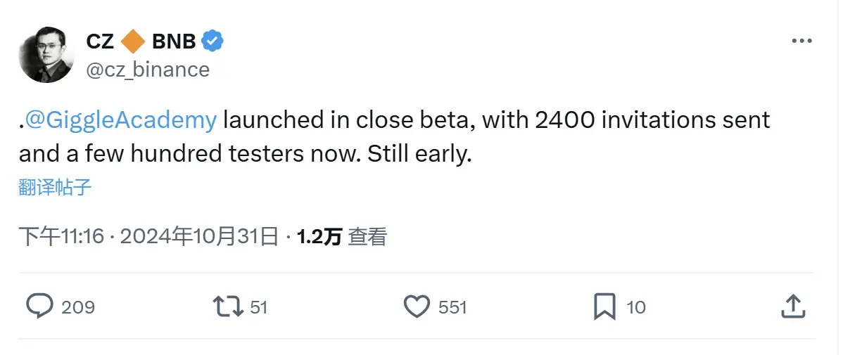 赵长鹏:Giggle Academy 已推出封闭测试版,发出 2400 个邀请