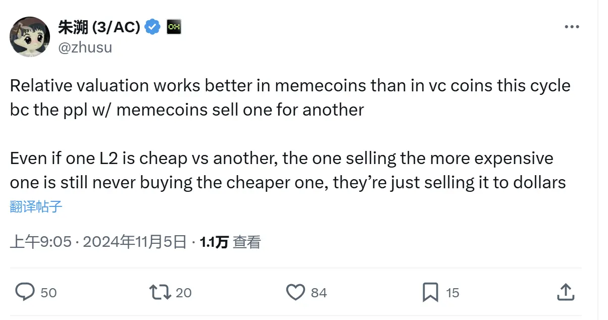 ChainCatcher 消息,三箭资本创始人 Zhu Su 发文称:“相对估值于本轮周期中在 MEME 币中比 VC 币更有效,因为持有 MEME 币的人通常会卖出一种来换取另一种。