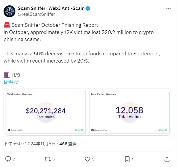 Scam Sniffer:十月份约有 1.2 万名受害者因加密货币网络钓鱼诈骗损失 2020 万美元