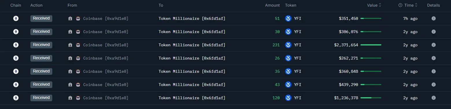 ChainCatcher 消息,据 Onchain Lens 监测,经过 2 年的沉寂,一巨鲸再次提取了枚 YFI。7 小时前,该巨鲸在沉寂 2 年后从 Coinbase 提取了 51 枚 YFI,价值 35.1 万美元。