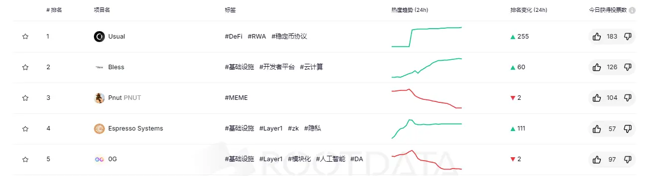 ChainCatcher 消息,根据 Web3 资产数据平台 RootData 热度指数排行数据显示,截止 11 月 15 日 10:00,Web3 热门项目 Top 100 排名前五的项目依次为:Usual、Bless、Pnut、Espresso Systems、0G。