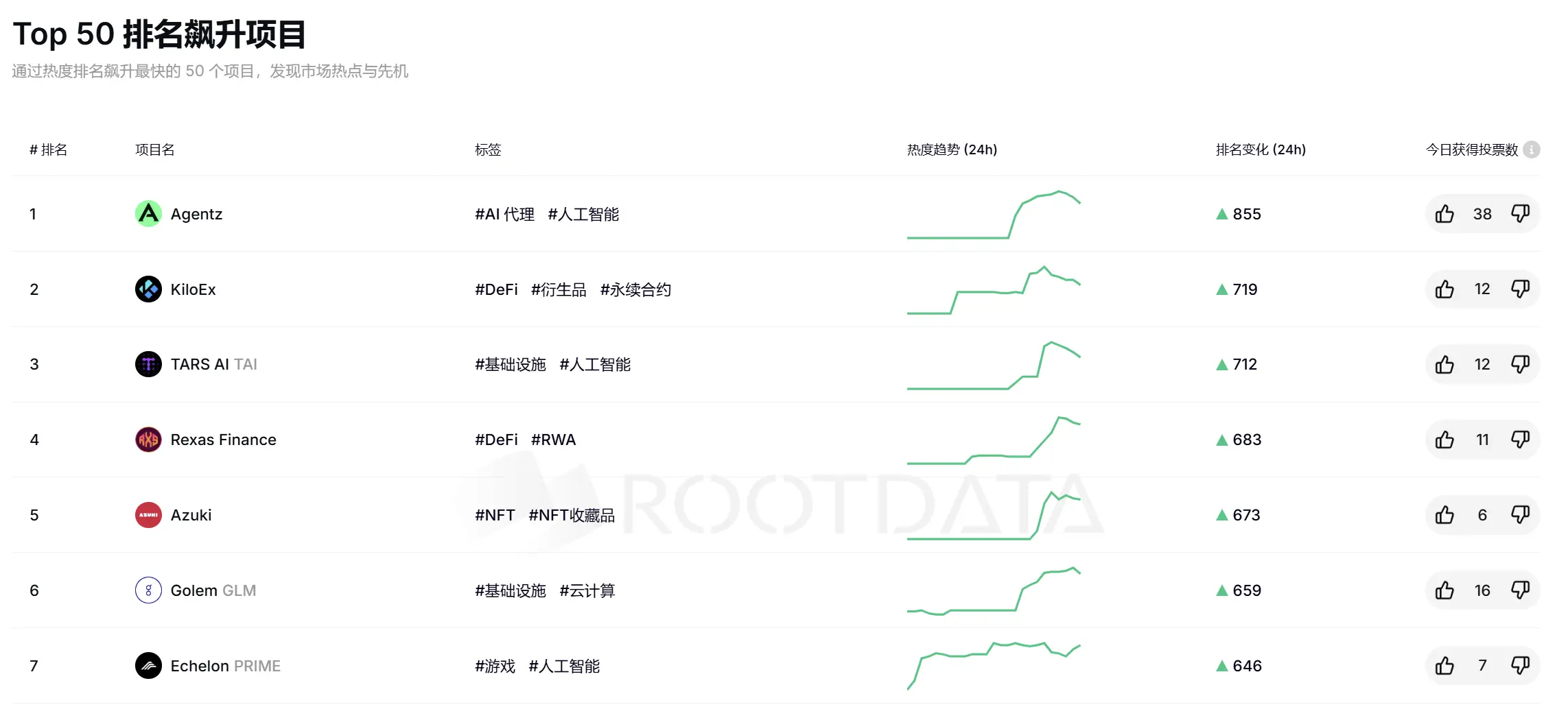 RootData Top 50 项目排名飙升榜:Agentz 位居第一,KiloEx 排名第二