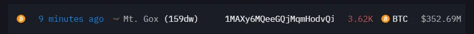 ChainCatcher 消息,据 Arkham 监测,Mt. Gox 地址 9 分钟前向两个地址转出 3620 枚比特币,价值约合 3.5269 亿美元。