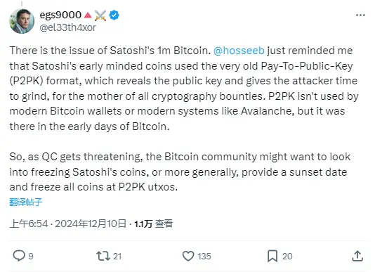 ChainCatcher 消息,Ava Labs 创始人 Emin Gün Sirer 表示,“虽然量子计算的最新发展令人惊叹,但它们不会对加密货币的安全构成威胁,至少目前还没有!至于中本聪的 100 万枚比特币可能存在量子威胁的问题,它使用了非常古老的付费公钥(P2PK)格式,该格式会泄露公钥并给攻击者提供时间。随着 QC 受到威胁,比特币社区可能希望考虑冻结中本聪的代币,或者更一般地说,提供一个关停日期并冻结 P2PK utxos 上的所有代币。”