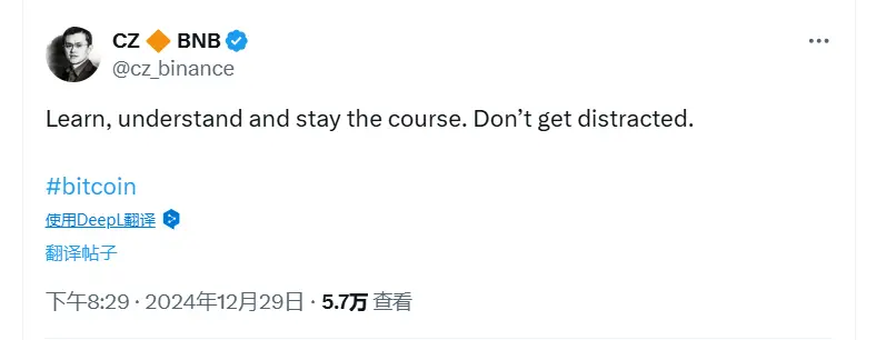 赵长鹏发文勉励比特币社区:学习、理解并坚持下去,不要分心