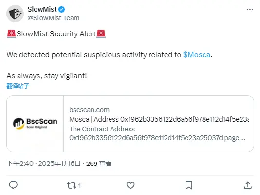 ChainCatcher 消息,慢雾发布推文表示,其已检测到与 BNB Chain 上代币 Mosca 相关的潜在可疑活动。