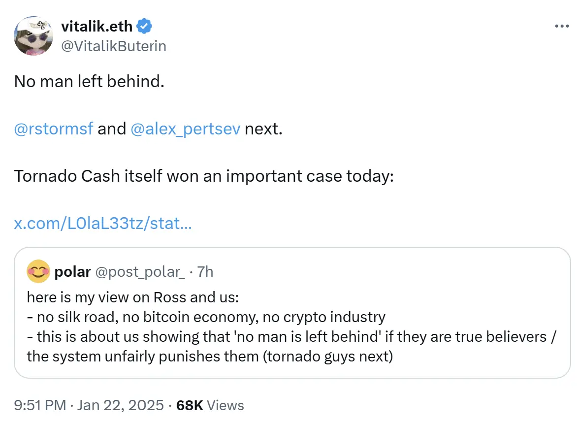 ChainCatcher 消息,以太坊创始人 Vitalik Buterin 发文称,没有一个人掉队,继丝绸之路创始人 Ross Ulbricht 被释放后,Tornado Cash 今日也赢得了一个重要案件,Tornado Cash 团队成员 Alexey Pertsev 和 Roman Storm 是下一个。