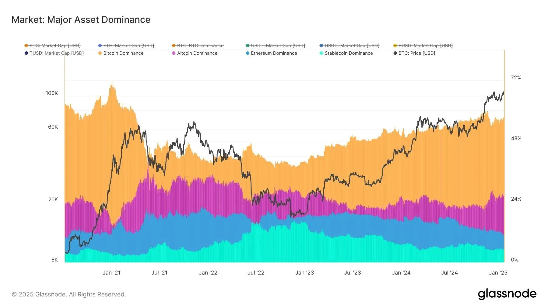 ChainCatcher 消息,加密研究机构 Glassnode 在社交平台发文表示,比特币市场主导地位正在攀升。继 2024 年 12 月触底约 54% 后,比特币主导地位在 2025 年 1 月已突破 57%。