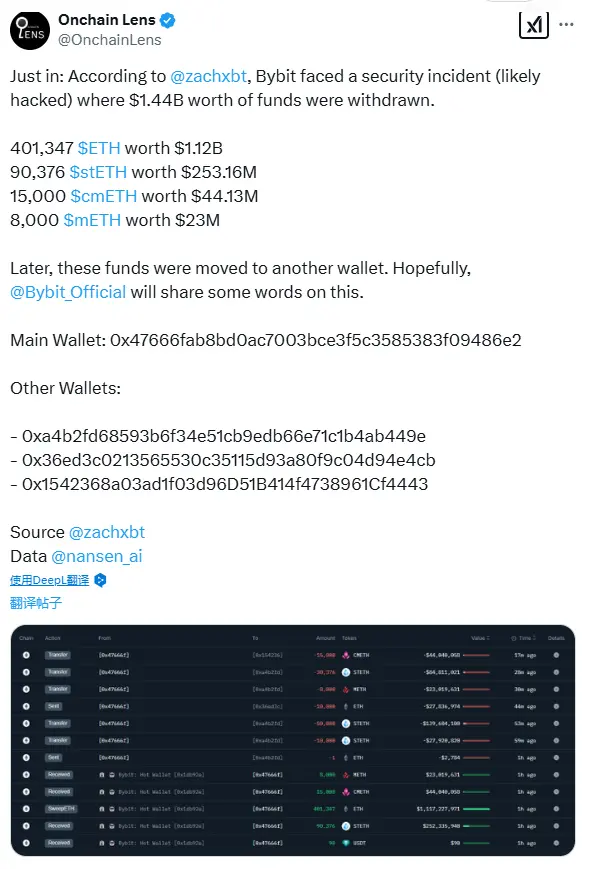 ChainCatcher 消息,据 Onchain Lens 披露,ZachXBT 监测 Bybit 遭遇安全事故,价值 14.4 亿美元的资金被提取,分别包括: