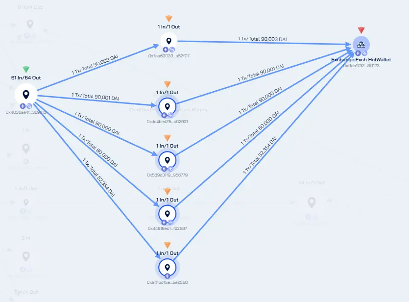 目前 Bybit 黑客销赃模式趋于稳定,主要使用 Thorchain 将资产转移至 BTC 公链,以及利用 OKX DEX 兑换为 DAI 再进行流转,兑换的 DAI 会流入 eXch。