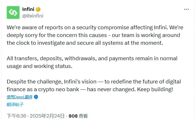 ChainCatcher 消息,稳定币数字银行 Infini 发布公告表示,“我们了解到有关影响 Infini 的安全漏洞的报告。我们对由此引起的担忧深感抱歉,团队目前正在全天候调查并保护所有系统。