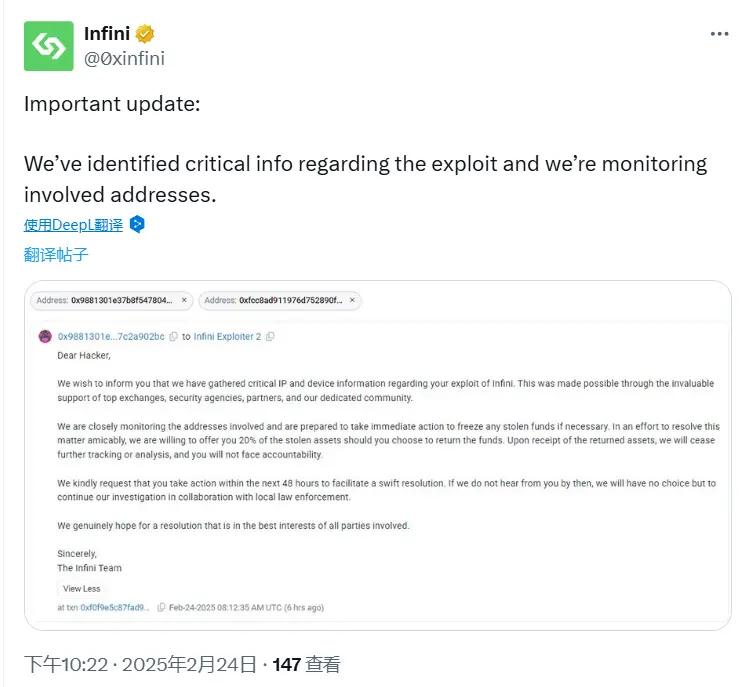 Infini 在 X 平台发文更新了黑客攻击事件进度,披露目前已经确定了有关该漏洞的关键信息,并且正在监控涉及的地址。
