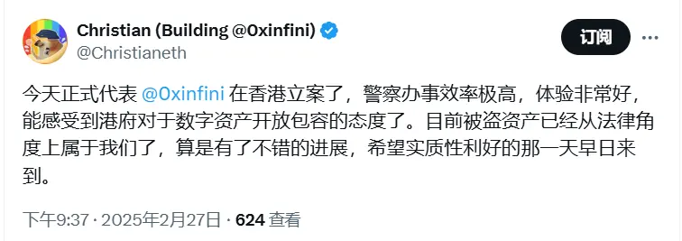 ChainCatcher 消息,稳定币数字银行 Infini 创始人 Christian 发文表示,“今天正式代表 Infini 在香港立案了,警察办事效率极高,体验非常好,能感受到港府对于数字资产开放包容的态度。
