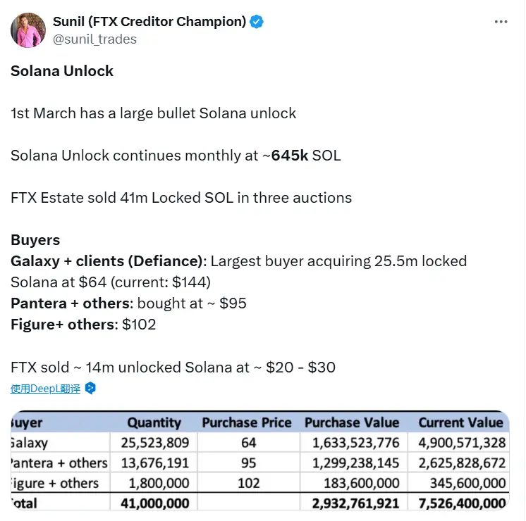 ChainCatcher 消息,FTX 债权人代表 Sunil 发文表示,FTX Estate 在三次破产拍卖中出售了 4100 万锁仓的 SOL,买家分别为: