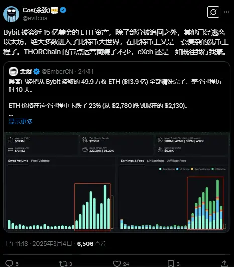 ChainCatcher 消息,慢雾余弦发文称,“Bybit 被盗近 15 亿美元的 ETH 资产,除了部分被追回之外,其他已经离开以太坊,绝大多数进入了比特币网络,并在比特币上展开复杂的洗币操作,THORChain 的节点运营商获利不少。”