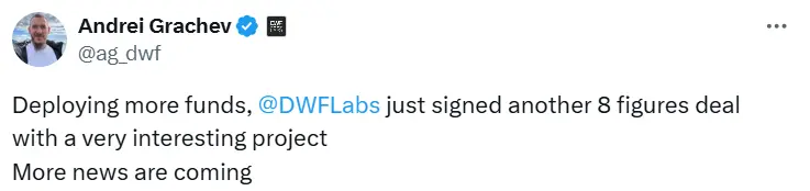 ChainCatcher 消息,DWF Labs 合伙人 Andrei Grachev 在 X 平台发文称:“DWF Labs 部署更多资金,刚与一极具吸引力的项目签署八位数交易,更多消息敬请期待。”