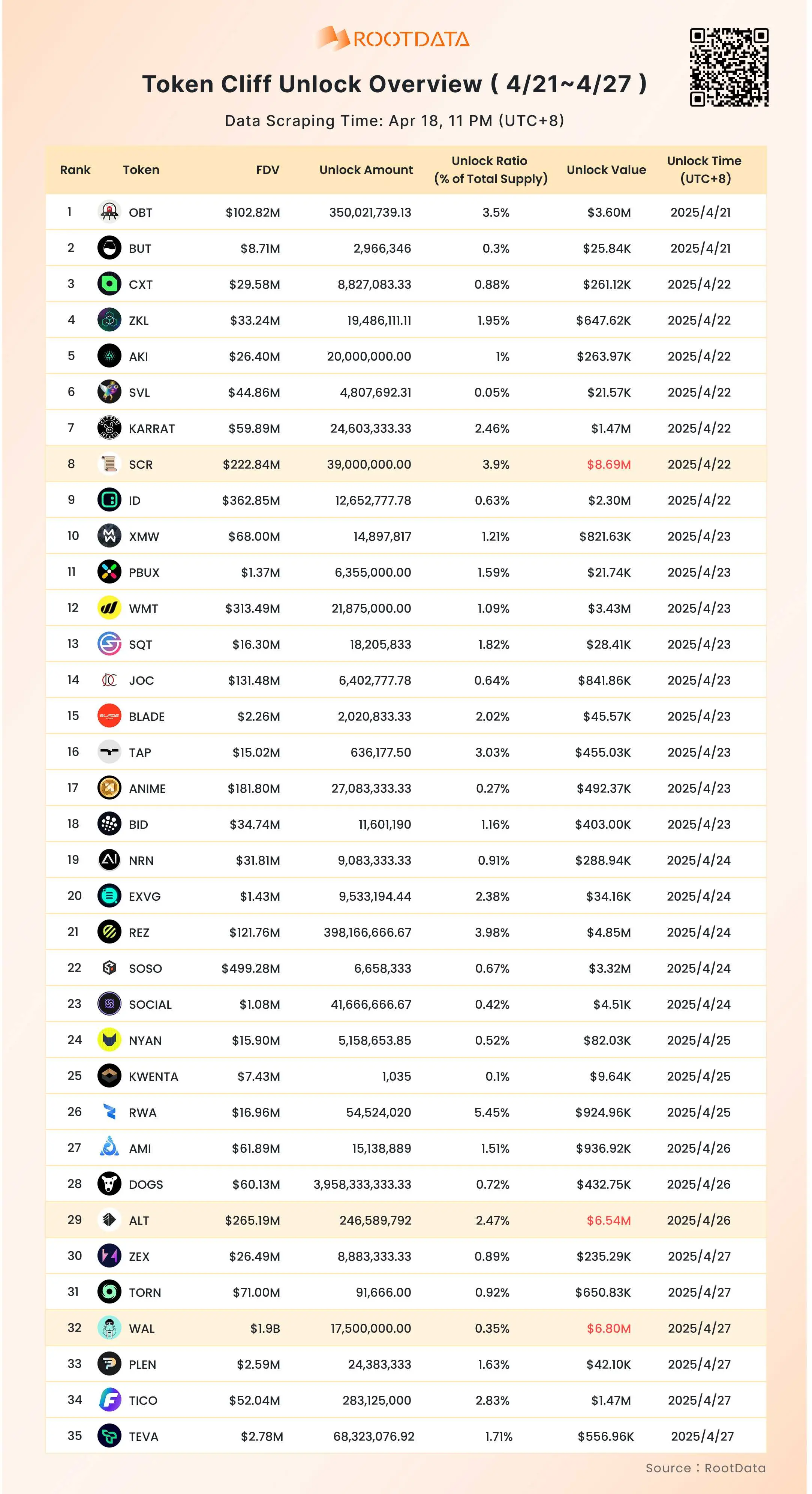ChainCatcher 消息,据 RootData 官方消息,4 月 21 日至 4 月 27 日期间,35 种代币将迎来一次性解锁。其中 SCR、WAL 及 ALT 解锁价值超过 500 万美元: