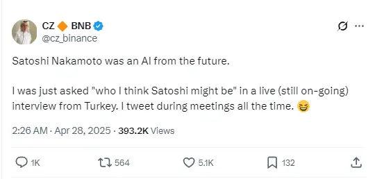 ChainCatcher 消息,币安创始人赵长鹏在社交媒体发文表示,“中本聪 (Satoshi Nakamoto) 是来自未来的人工智能。我刚刚在土耳其的一次直播采访(仍在进行中)中被问到“我认为中本聪可能是谁”。我开会的时候总是发推文。”