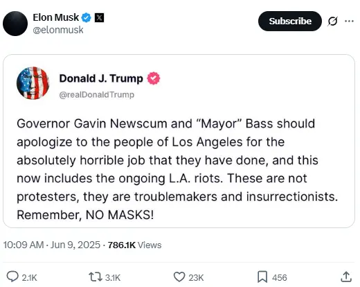 ChainCatcher 消息,马斯克在 X 上发布截图,转发美国总统特朗普在“真实社交”平台上的言论。特朗普称,“加州州长加文·纽瑟姆和「市长」巴斯应该为他们所做的糟糕表现向洛杉矶人民道歉,这还包括目前正在进行的洛杉矶骚乱。这些人不是抗议者,而是麻烦制造者和叛乱分子。记住,别戴口罩。”