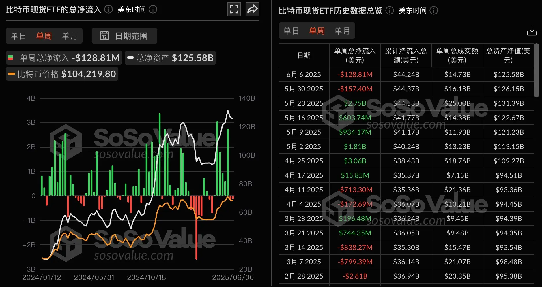 ChainCatcher 消息,根据 SoSoValue 数据,上周交易日(美东时间 6 月 2 日至 6 月 6 日)比特币现货 ETF 上周单周净流出 1.29 亿美元。