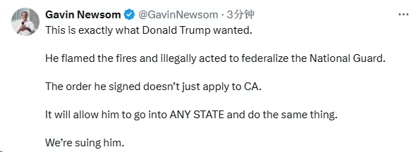 ChainCatcher 消息,美国加州州长纽森在社交媒体表示,特朗普煽动事端,并非法采取行动将国民警卫队联邦化。他签署的命令不仅适用于加州,这将使他能够进入任何一个州并做同样的事情,我们将就国民警卫队部署问题起诉特朗普政府。