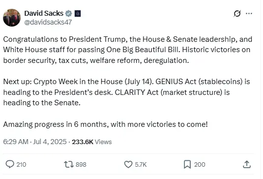 ChainCatcher 消息,白宫加密货币和人工智能主管、“加密沙皇”David Sacks 发文表示,7 月 14 日当周是众议院加密货币周:《GENIUS 法案》即将送达总统。而《CLARITY 法案》(美国数字资产市场明确法案)也即将送达参议院。