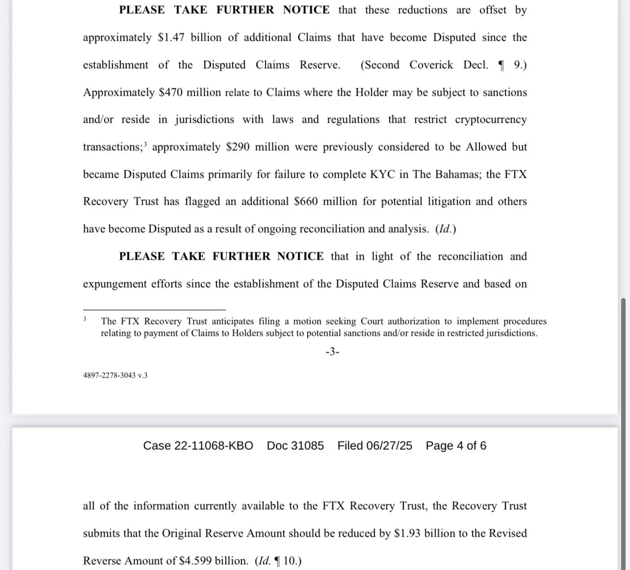 KYC 未完成(巴哈马)的索赔有 2.9 亿美元,有争议的多项索赔总额为 6.6 亿美元,正在等待索赔解决方案的总额 14 亿美元,最后预计允许索赔的总额 110 亿美元。