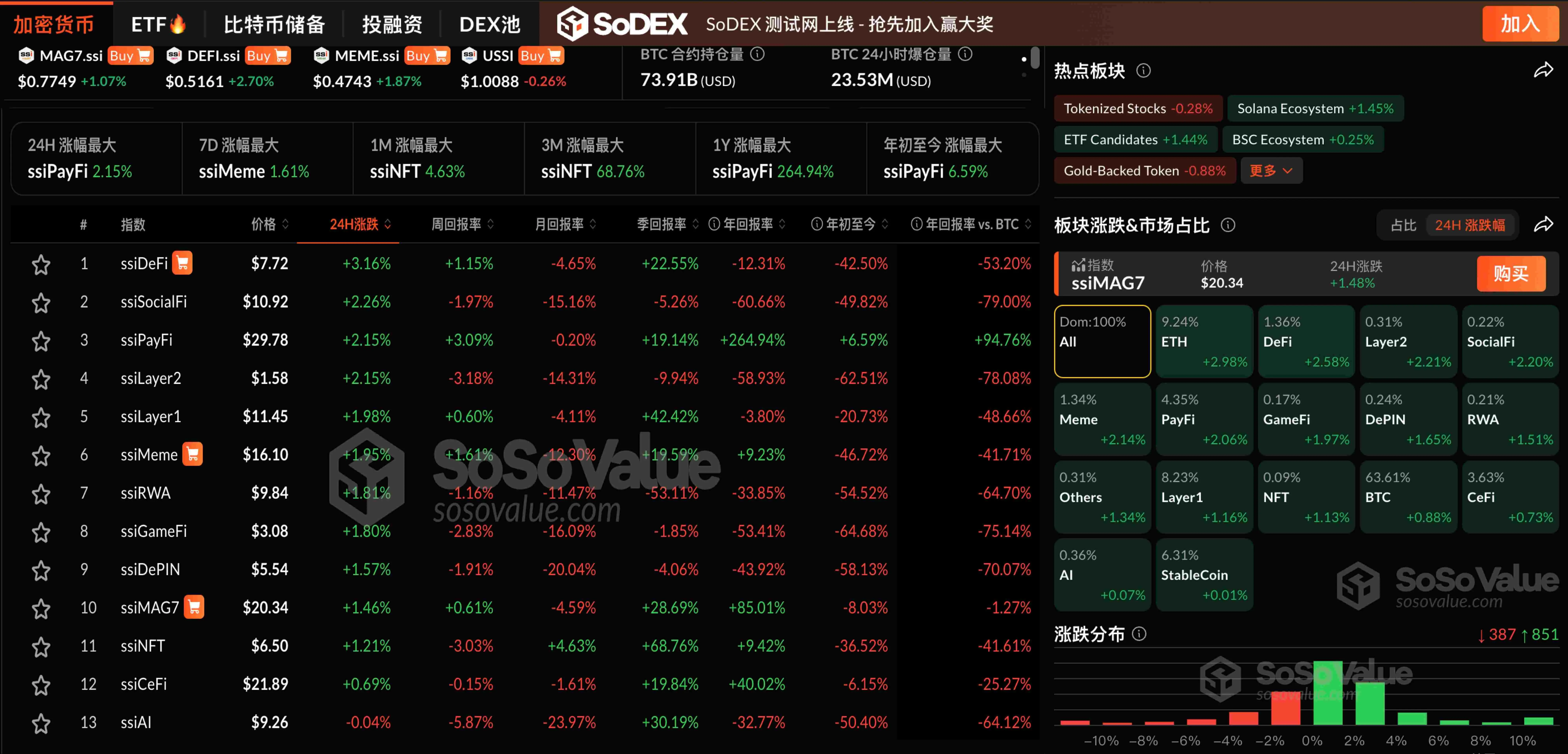 反映板块历史行情的加密板块指数显示,ssiDeFi、ssiSocialFi、ssiPayFi 指数 24 小时分别上涨 3.16%、2.26%、2.15%。