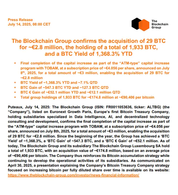 The Blockchain Group 增持 29 枚比特币,目前总持仓达 1933 枚