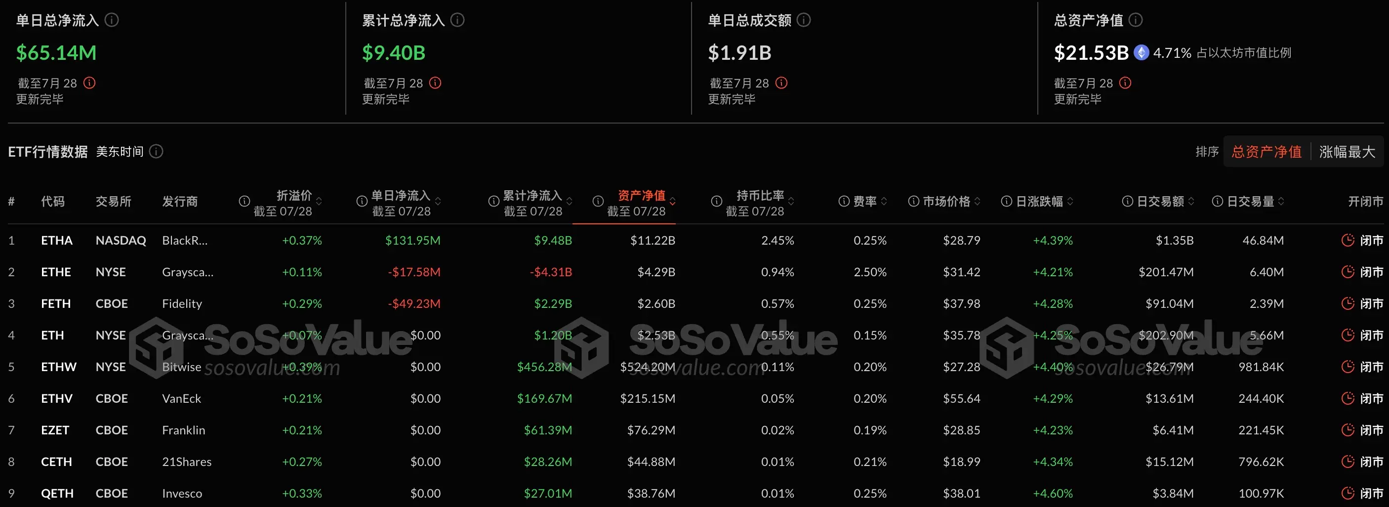 昨日单日净流入最多的以太坊现货 ETF 为贝莱德(Blackrock) ETF ETHA,单日净流入为 1.32 亿美元,目前 ETHA 历史总净流入达 94.80 亿美元。