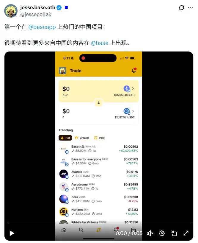 ChainCatcher 消息,Base 联创 Jesse Pollak 在 X 平台发文表示,Base 人生是第一个在 Base App 上热门的项目,很期待看到更多来自中国的内容在 Base 网络上出现。