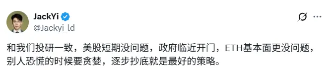 ChainCatcher 消息,Liquid Capital(前 LD Capital)创始人易理华在 X 平台发文表示,美国政府临近开门,ETH 基本面没问题,别人恐慌的时候需要贪婪,逐步抄底就是最好的策略。