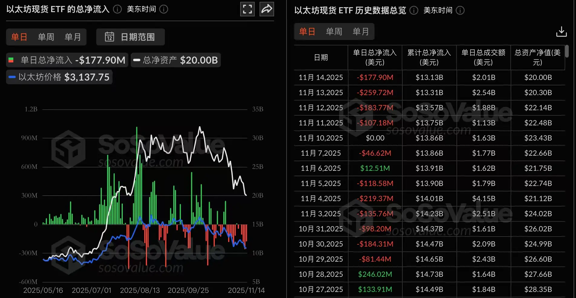 ChainCatcher 消息,根据 SoSoValue 数据,昨日(美东时间 11 月 14 日)以太坊现货 ETF 总净流出 1.78 亿美元。