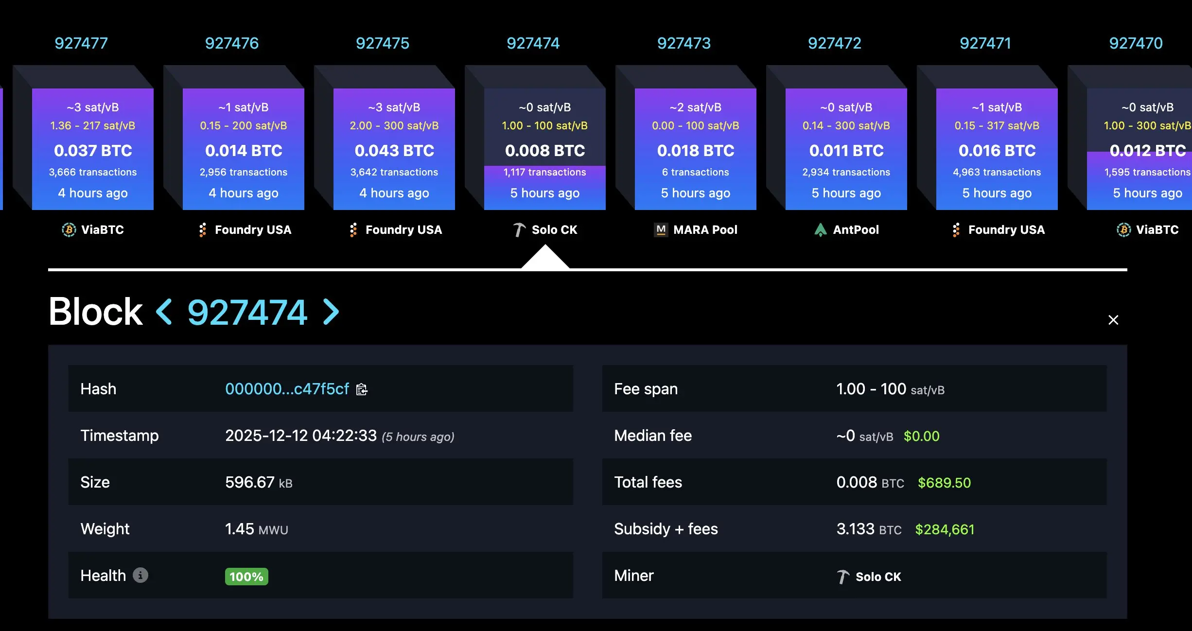 某独立矿工成功挖出 927474 区块,获得区块奖励 3.133 枚 BTC