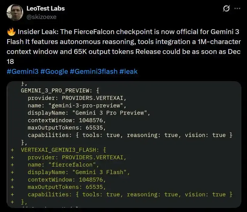 ChainCatcher 消息,据 PolyBeats 消息,X 用户 skizoexe 发布截图显示,此前在 LM Arena 盲测中曝光的 Gemini 模型代号“fierceFalcon”疑似已被确认为即将发布的 Gemini 3.0 Flash。