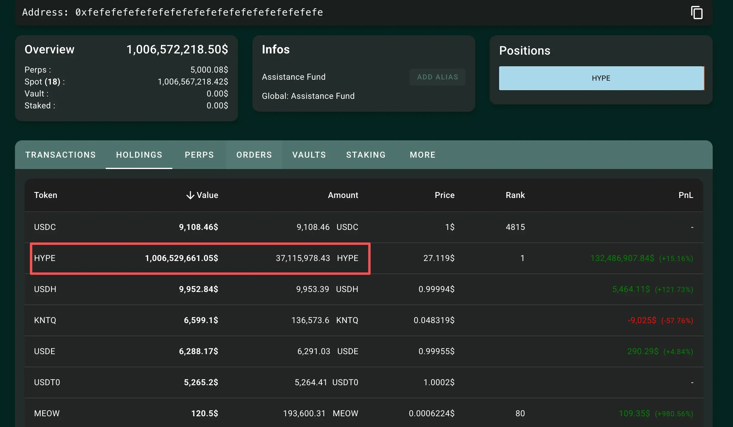 ChainCatcher 消息,链上数据显示,目前 Hyperliquid 的 Assistance Fund 地址中持有 37114029 枚 HYPE,对应价值约 10.1 亿美元。若 Hyperliquid 基金会的销毁提案通过,将使 HYPE 的流通供应量减少 13%。