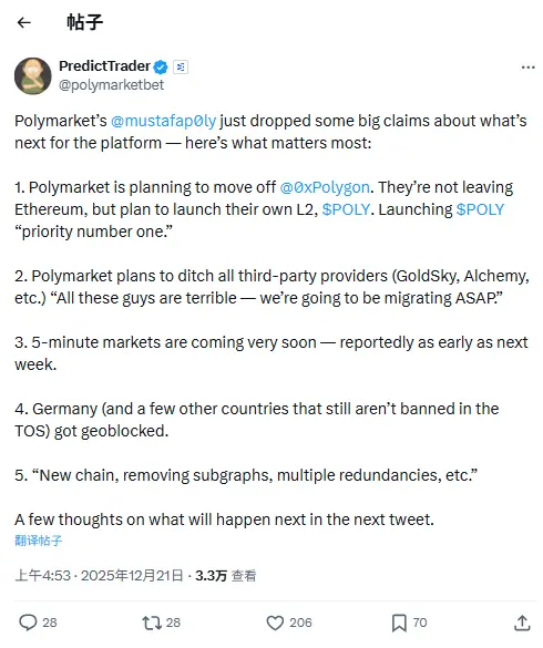 1. Polymarket 计划从迁移 Polygon 出去,并计划推出自己的以太坊 L2 服务 POLY。推出 POLY 是“首要任务”。(Polymarket 业务曾于 12 月 18 日受 Polygon 宕机影响。)