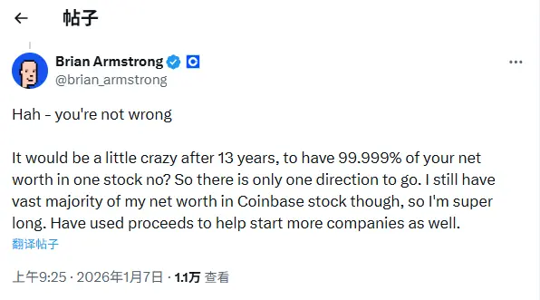 ChainCatcher 消息,Coinbase 创始人 Brian Armstrong 于 X 发文回应用户关于其持续出售 COIN 股票的质疑时表示:“我是卖了,但创业 13 年了,如果我还把 99.999% 的净资产都放在一只股票上,那是不是太疯狂了?所以这是必然的选择。不过,我目前绝大部分净资产仍然是 COIN,我对未来非常看好。同时,我也用部分收益帮助创立了更多公司。”