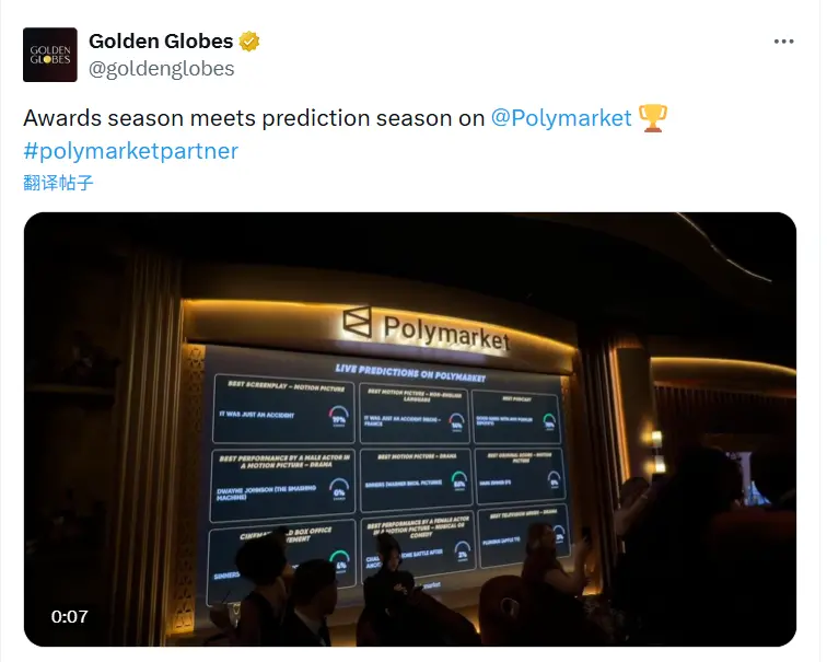 金球奖现场推出 Polymarket 金球奖预测市场看板