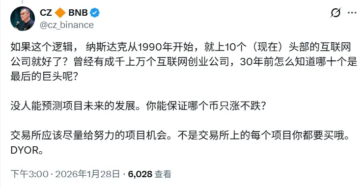 CZ:并非交易平台上线的每个项目都应买入,没人能保证某个币只涨不跌