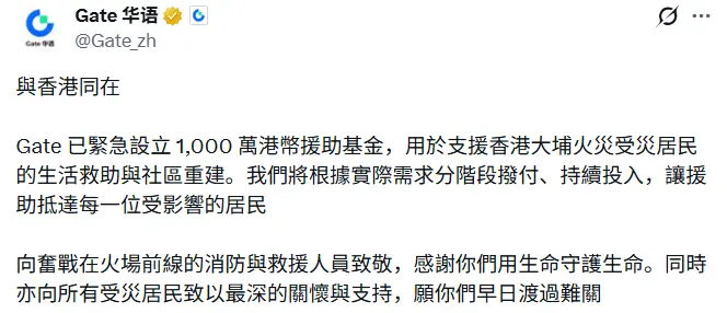 Gate は緊急に 1,000 万香港ドルの援助基金を設立し、香港大埔の火災で被災した住民の生活支援とコミュニティ再建に使用します。