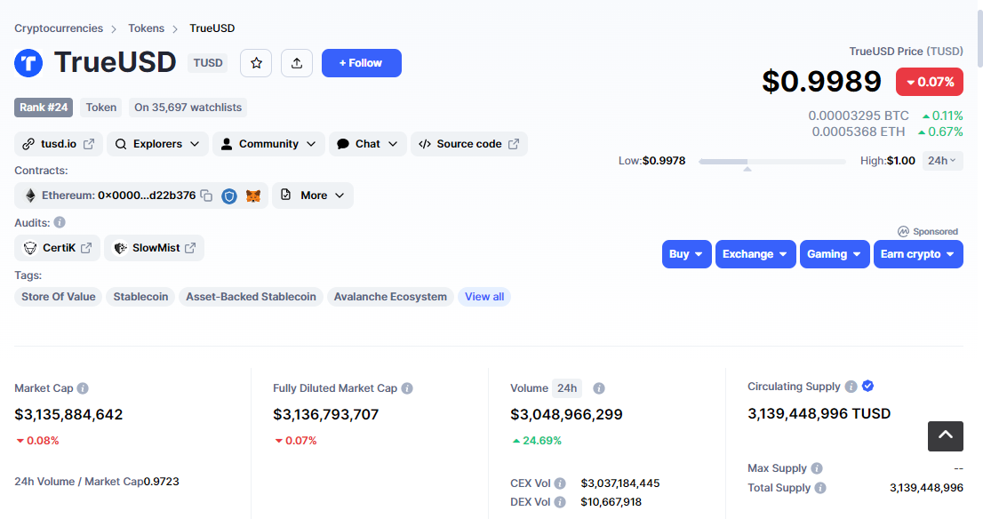 Prime Trust가 입출금을 중단한 후, TrueUSD는 Prime Trust와 관련된 계좌를 가진 고객에게 이메일을 통해 Prime Trust의 운영 중단 기간 동안 TUSD 스테이블코인을 발행하거나 교환할 수 없다고 알렸다. Binance가 자사 플랫폼에서 TrueUSD를 대대적으로 홍보하기 시작하면서, TrueUSD는 한때 잘 알려지지 않았던 스테이블코인 프로젝트에서 주류로 부상하며 시장 점유율이 급격히 증가했다. Coinmarketcap 데이터에 따르면, 발행 시점 기준으로 TUSD의 총 발행량은 거의 314억 달러에 달한다.