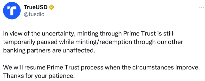 이전 중지 명령에 대해, Prime Trust의 수탁 고객 중 하나인 스테이블코인 TrueUSD는 즉시 반응했다: 자사의 스테이블코인 TUSD 자금은 여전히 안전하며, TrueUSD는 Prime Trust의 위험 노출이 없고, 이 상황의 영향을 받지 않으며, 모든 사용자 자금은 안전하다고 밝혔다. 그리고 이달 10일, TrueUSD는 Prime Trust를 통한 발행을 일시 중지한다고 발표했다.