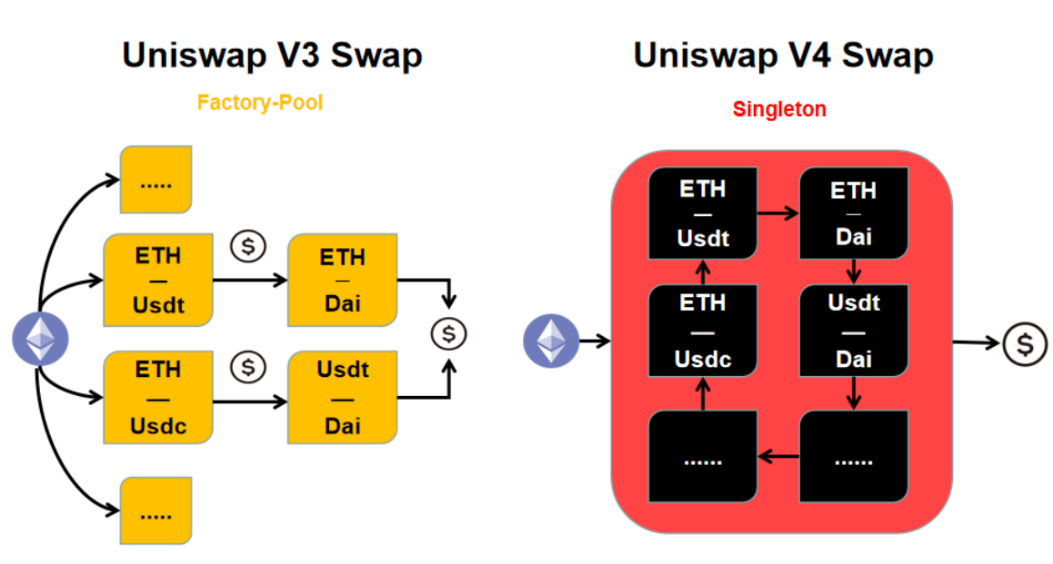 Uniswap의 이전 버전에서 Factory-Pool은 V1부터 현재까지 사용된 계약 구조로, DeFi 세계의 많은 DEX와 파생상품에서 가장 많이 사용되는 계약 구조입니다. 그러나 V4 버전에서는 Factory-Pool을 버리고 단일 계약인 "Singleton" 구조로 대체되었습니다. V3에서는 유동성 풀을 생성할 때마다 새로운 계약을 다시 배포해야 하므로 배포 비용이 매우 비쌌습니다. 그러나 V4에서는 단일 구조가 모든 유동성 풀을 하나의 계약에 저장하여 유동성을 생성하고 크로스 체인 풀(계약)에서의 가스 소비를 최대한 줄일 수 있습니다. 이렇게 하면 토큰 거래가 서로 다른 계약 간에 이동할 필요가 없으며, V3 기반에서 가스 비용을 99%까지 줄일 수 있습니다.